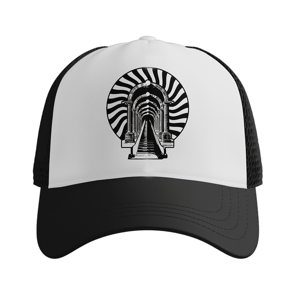 White Front and Black body trucker hat with Artifical Paradise spiral printed on front.