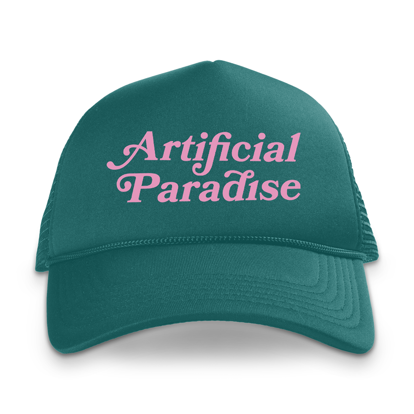 Teal trucker hat with "Artificial Paradise" printed on front in pink.