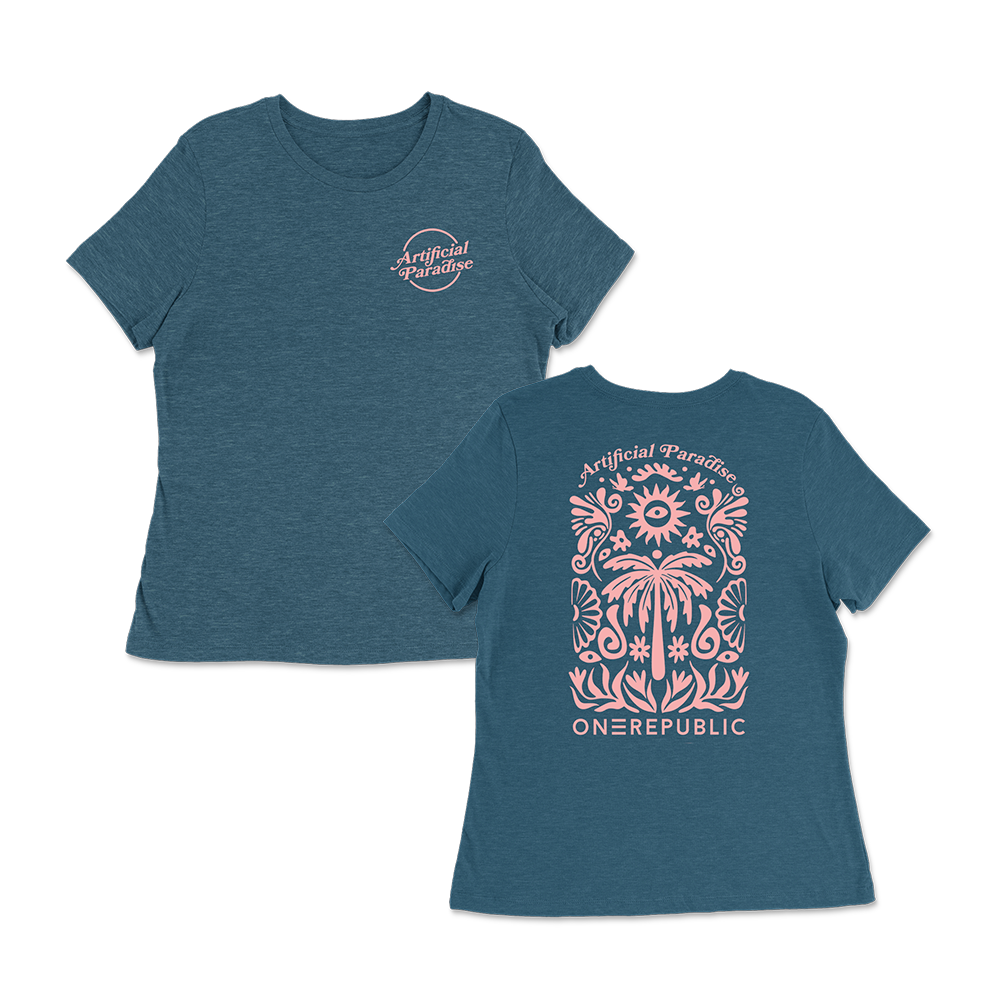 Teal Women's cut tee with pink Artificial Paradise printed on front, and design on back.