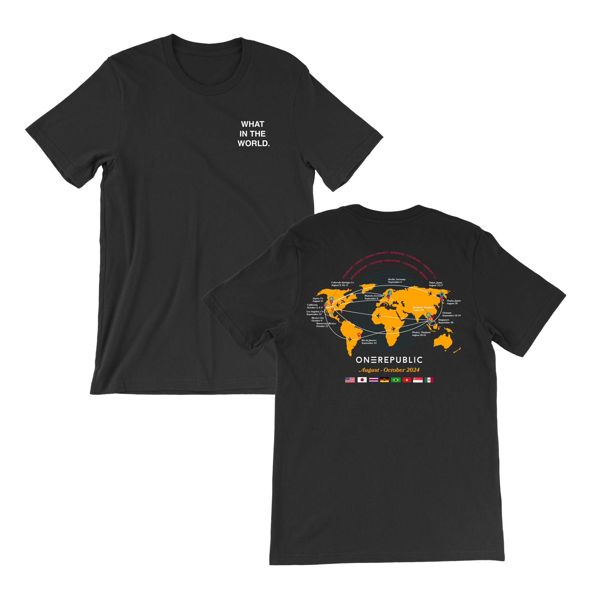 "What in the World" Tee - highlighting Onerepublic's travel from August 2024 - October 2024, around the world a couple times...